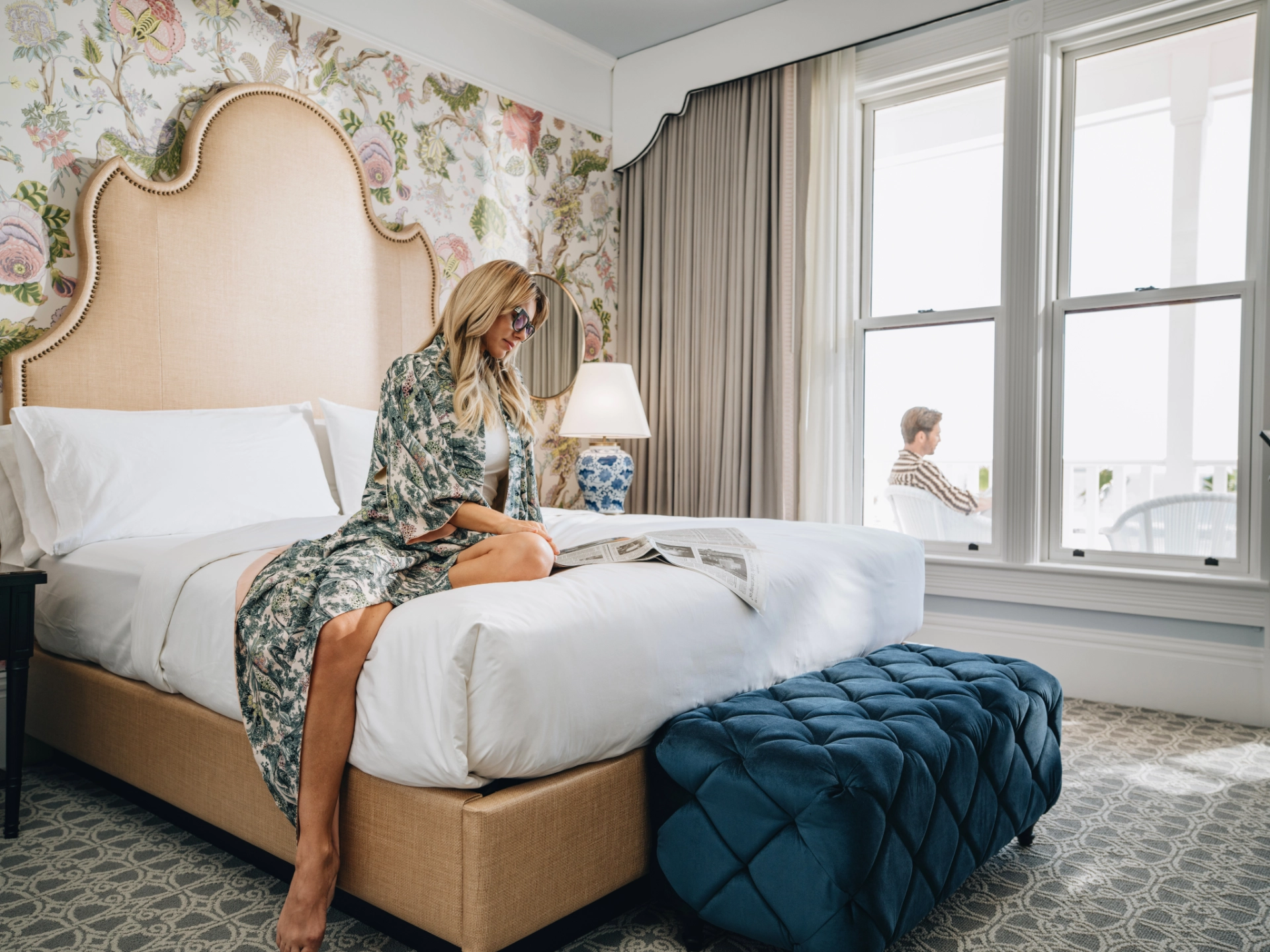 Newly renovated second-story Junior Cottage with oceanfront balcony, separate bedroom with fireplace, seating area, and marble bathroom.